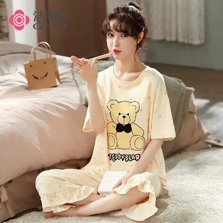 洁丽雅睡衣女2022年新款夏季短袖薄款网红纯棉宽松大码家居服套装